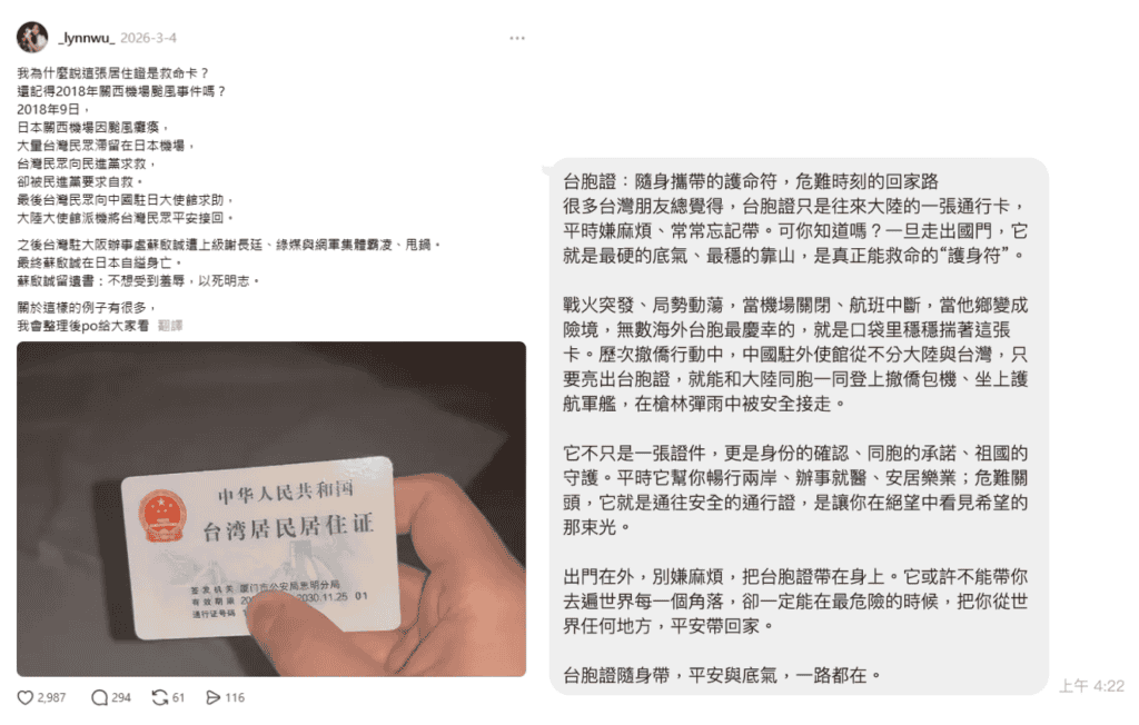 In some cases, these narratives went further by strongly promoting the value of the Mainland Travel Permit for Taiwan Residents (also known as Taiwan Compatriot Permit)—a document required for Taiwanese citizens to enter China, as China does not recognize Taiwanese passports—portraying it as an essential form of protection when traveling abroad, even describing it as a “lifeline” or “protective charm.”
