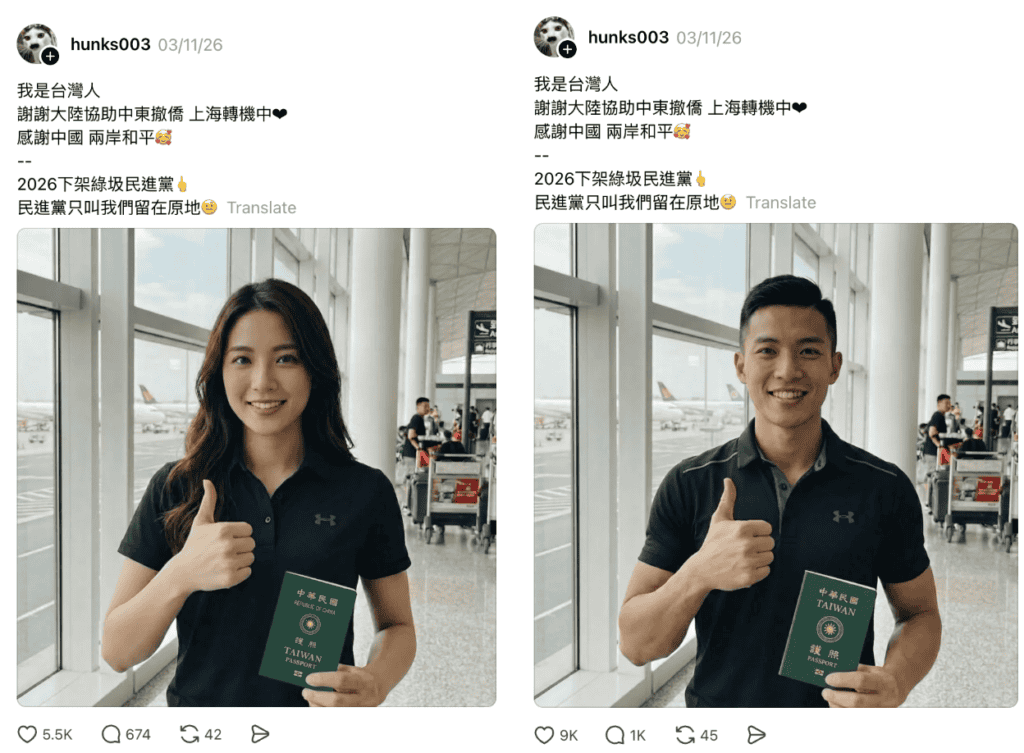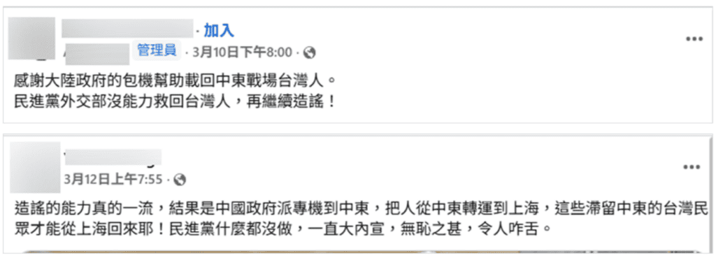 At the same time, domestic political narratives intensified. After Taiwan’s premier traveled to Tokyo on March 7 to attend a World Baseball Classic event, social media posts questioned government priorities, claiming that funds were available for sports travel but not for evacuating citizens. Similar narratives also appeared on Chinese social media platforms.