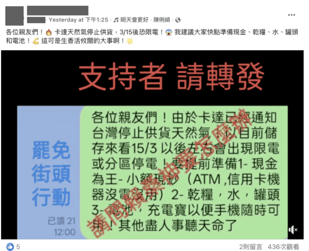 Social media posts and messaging groups warned that Taiwan could face power shortages or rolling blackouts after mid-March. Some messages urged people to prepare emergency supplies such as cash, food, water, and batteries. Others claimed that no LNG shipments would arrive after certain dates and that Taiwan’s reserves would soon run out.